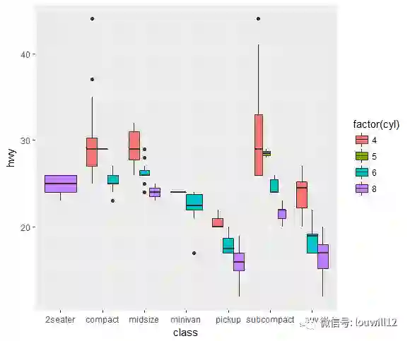 ggplot(mpg, aes(class, hwy, fill = factor(cyl))) +