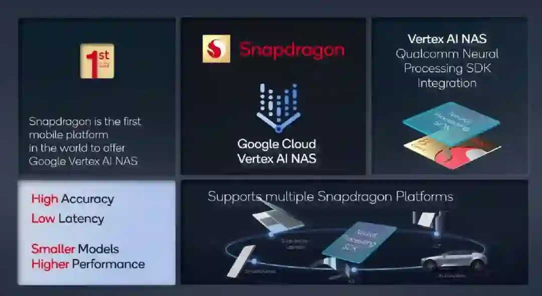 骁龙是全球首个支持 Google Cloud Vertex AI NAS 的移动平台。此前,高通有关提炼最佳神经网络架构的研究 DONNA 还被人工智能学术顶会 ICCV 2021 接收。高通希望在未来让 NAS 功能帮助多端部署工作,让 AI 模型快速部署至手机、笔记本电脑、VR 设备和汽车上。