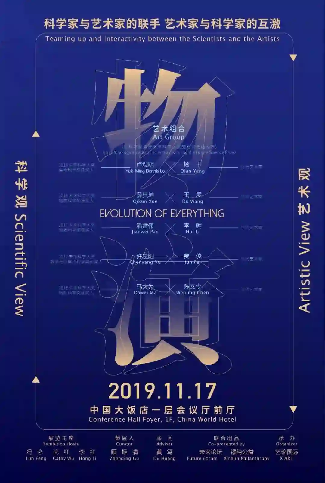 展览邀请著名策展人顾振清策展,著名策展人黄笃担任顾问,由卢煜明、薛其坤、潘建伟、许晨阳、马大为(以科学家荣获未来科学大奖的时间前后为序)五位未来科学大奖获奖科学家与陈文令、费俊、李晖、王度、杨千(以姓氏拼音排序)五位著名当代艺术家,一对一分组进行联袂创作。
