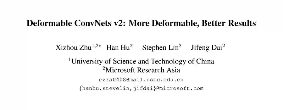 推荐理由:微软亚研代季峰老师组的文章,可形变卷积网络的加强版。可变形卷积网络的特征支持空间比常规的卷积网络更符合目标结构,但这种支持远远超出感兴趣的区域,导致特征受到不相关图像内容的影响。为了解决这个问题,DCNv2对网络中可变形卷积进行更全面的集成,引入一种扩展变形建模范围的调制机制,增强了建模能力。为了有效地利用这种丰富的建模能力,其通过提出的特征模拟方案指导网络训练,该方案帮助网络学习特征,这些特征反应目标焦点和R-CNN网络分类能力的特征。