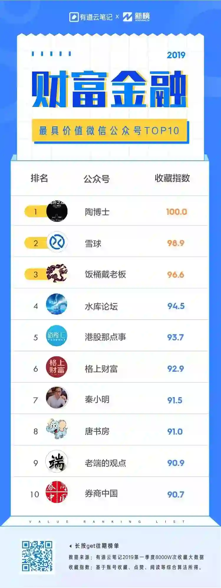 本次财富金融榜单变化较大,几乎一半的账号更替,新上榜的「格上财富」、「秦小明」、「唐书房」、「老端的观点」和「券商中国」,多维度提供财经解读内容。当前经济增速放缓,P2P暴雷潮频发,更需要我们以理智的态度让财富实现增值。