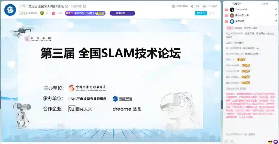 2022年7月16日-17日,“第三届全国SLAM技术论坛”成功举办,本次论坛由中国图象图形学学会主办,中国图象图形学学会三维视觉专委会和深蓝学院承办,图森未来、追觅科技协办。论坛邀请了22位学术界和企业届的专家围绕SLAM技术的研究、发展以及产业化应用作报告分享,吸引了来自全国各地4000多位领域爱好者参加此次活动,线上直播火爆,观众互动热情!