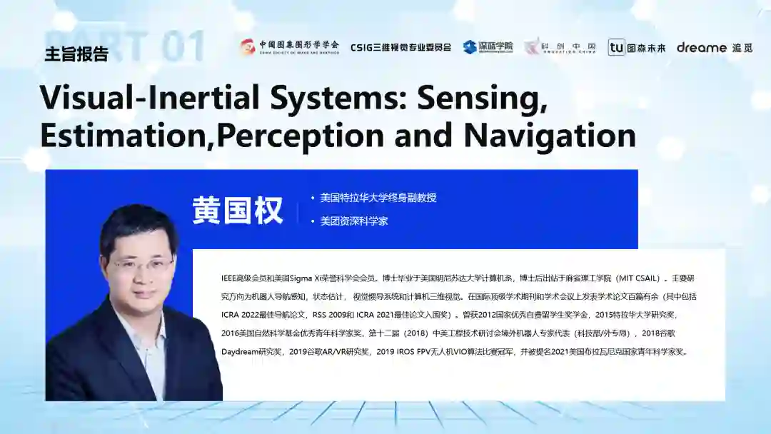 美国特拉华大学终身副教授黄国权老师的报告题目是:"Visual-Inertial Systems: Sensing,Estimation, Perception and Navigation",报告主要围绕视觉惯导系统展开,包括导航、感知等工作的介绍。