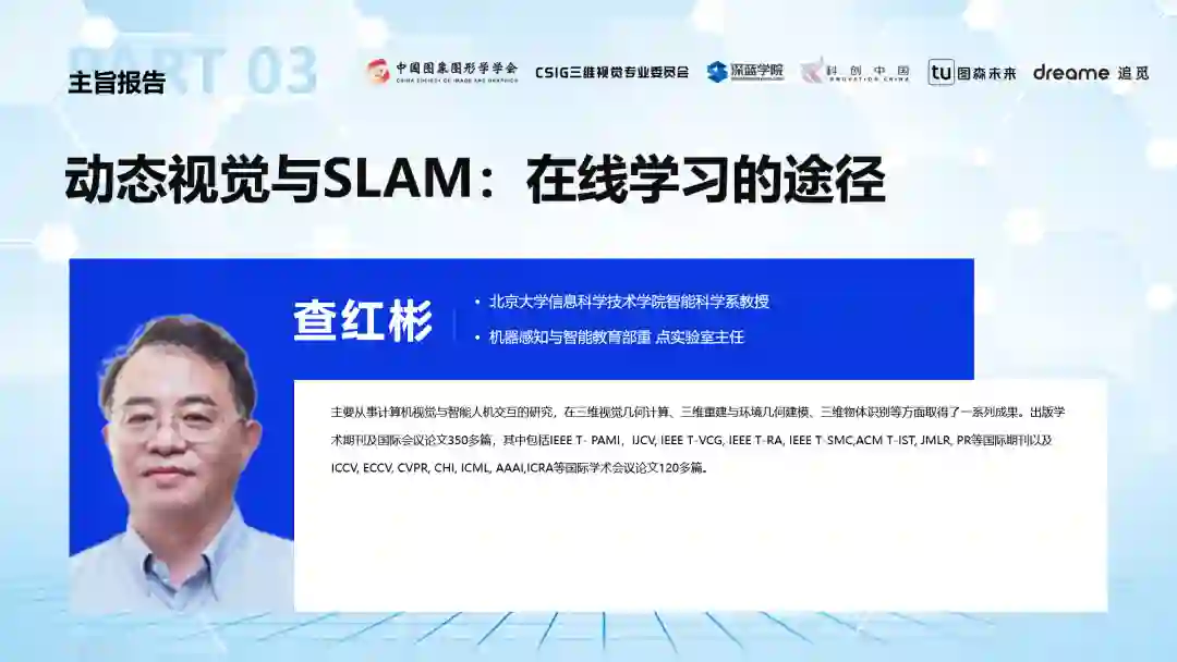 7月17日上午,北京大学教授查红彬老师带来“动态视觉与SLAM:在线学习的途径”的报告。报告围绕基于在线学习的SLAM问题,介绍了团队近来的一些想法和尝试,主要内容包括:面向自监督视觉里程计的序列对抗学习方法;具有在线自适应能力的自监督SLAM学习。