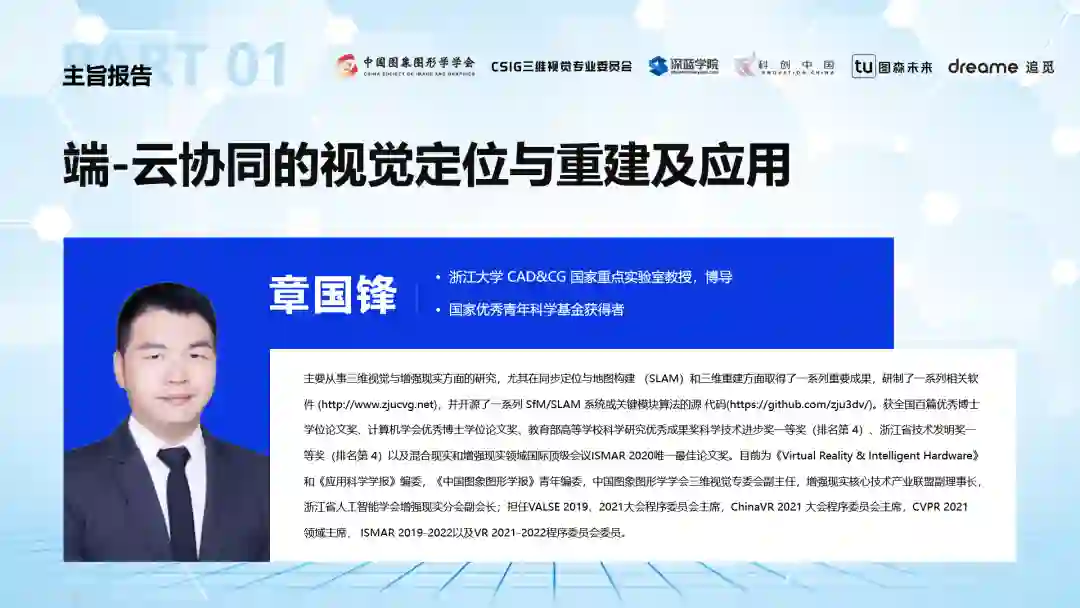 作为论坛的第一个报告,章国锋教授带来了 “端-云协同的视觉定位与重建及应用”的分享。基于视觉的跟踪定位和三维重建是计算机视觉领域的经典问题,在混合现实、机器人、自动驾驶等领域有着广泛的应用前景。章老师分享了近几年为了解决由于实际场景的复杂性产生的问题所做的研究工作以及研制的基于端云协同的混合现实平台,并展示其在定位导航和混合现实上的应用。
