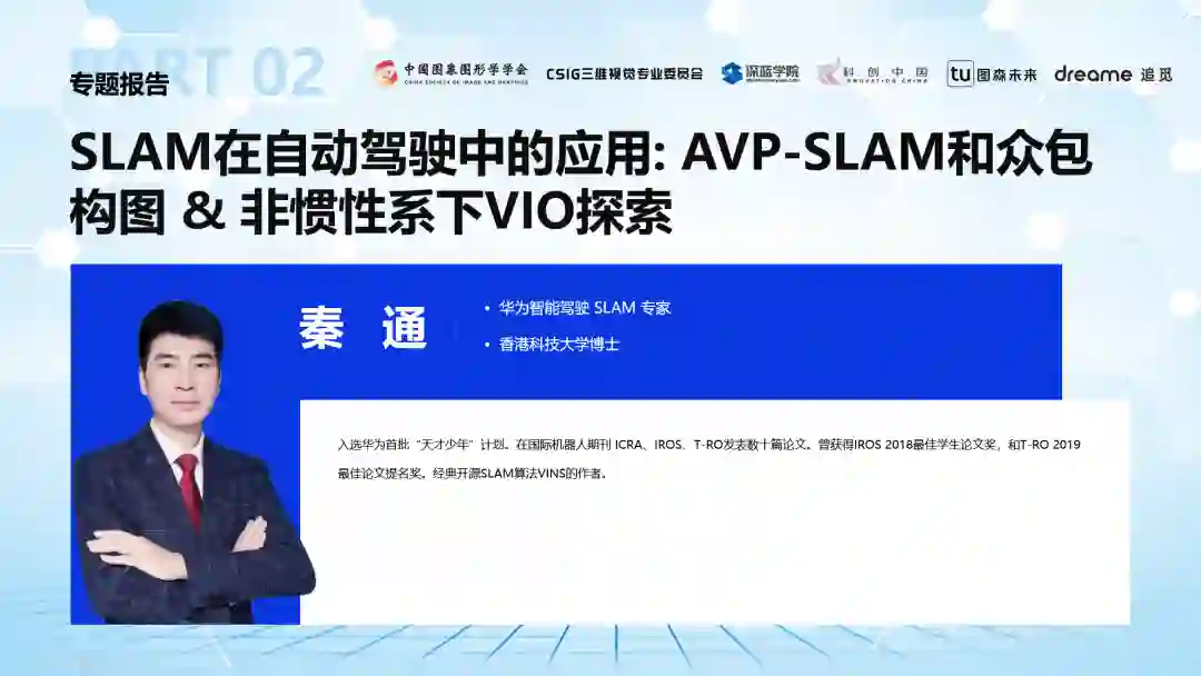 华为智能驾驶SLAM专家秦通老师的报告题目为:“SLAM在自动驾驶中的应用: AVP-SLAM和众包构图 & 非惯性系下VIO探索”。报告介绍了SLAM技术在自动驾驶方向的两个应用,分别是自动代客泊车(AVP)和众包构图。另外,报告也涉及了AR/VR方向的研究内容。