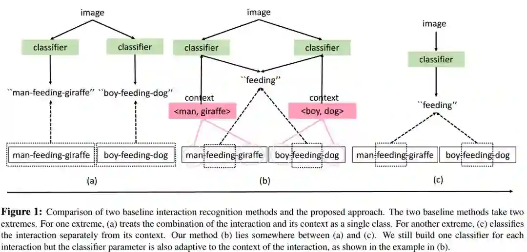 识别物体间的交互信息是视觉识别领域里一个重要的任务。如果我们定义交互的语境(context of the interaction)是与物体关联的,则现有的方法可以分为两类:(i)基于交互——语境组合训练一个单分类器;(ii)独立于显性语境地识别物体交互。两种方法都有其局限性:前者随着交互——语境组合数量增加而扩展的性能不佳,并且难以适用于未见过的交互语境组合;而后者则由于语境无关的交互分类器设计的困难性,常常造成较差的交互识别效果。