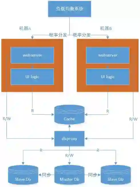 流量上升,计算能力提升的同时,也需要提升数据库的能力。这时候,我们可以采用读写分离。也就有了主从之说。主库可以写,当然也肯定能提供写,从库只能提供读,我们目前主从延时在20ms以内。目前这种工具不少,比如mysql proxy等。(下图应该是ui logic访问dbproxy,图有稍许错误,但是不影响理解)。