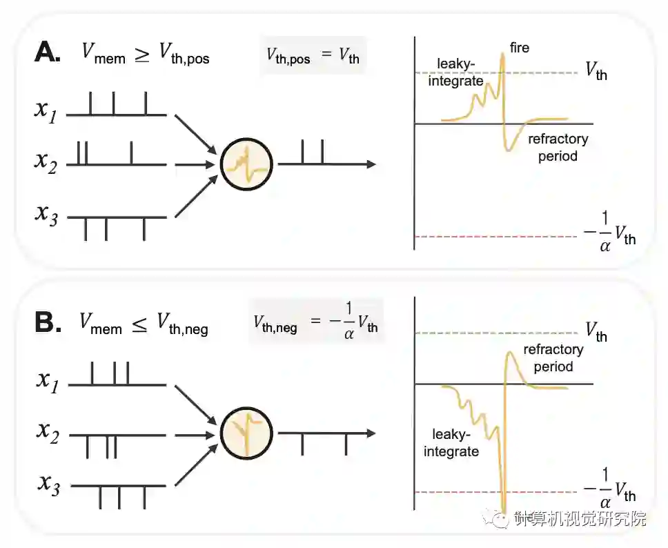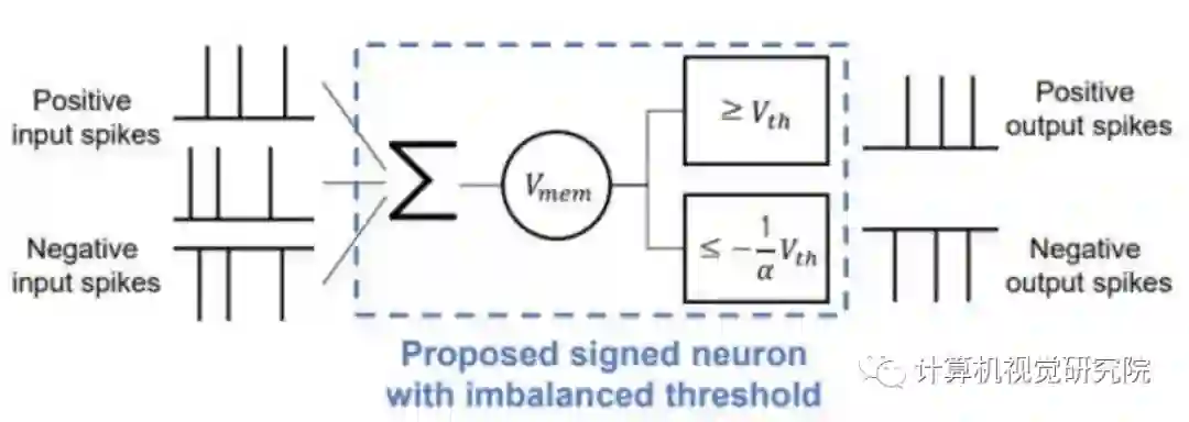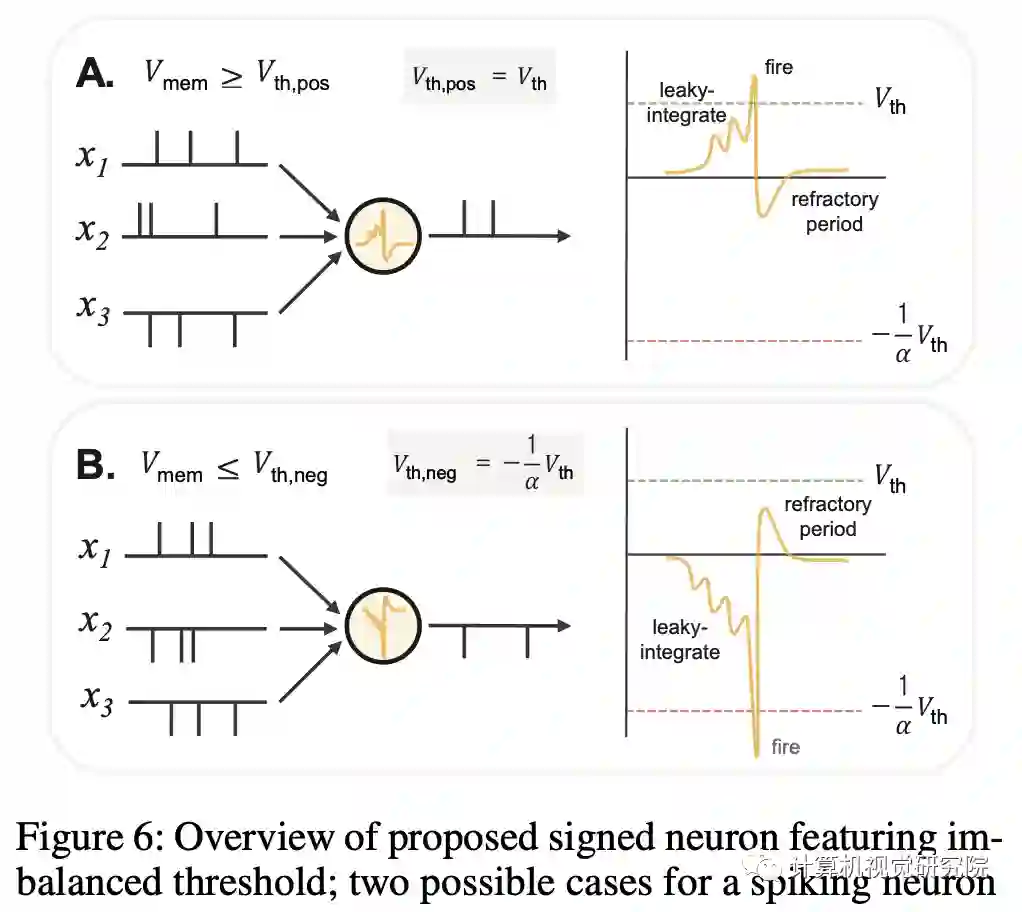 引入了一种具有不平衡阈值(即IBT)的带符号神经元,它不仅可以对正负激活进行解释,还可以对leakyReLU负激活值区域的渗漏项进行补偿。如下图所示,作者增加了另外一个Vth负责对负激活响应。
