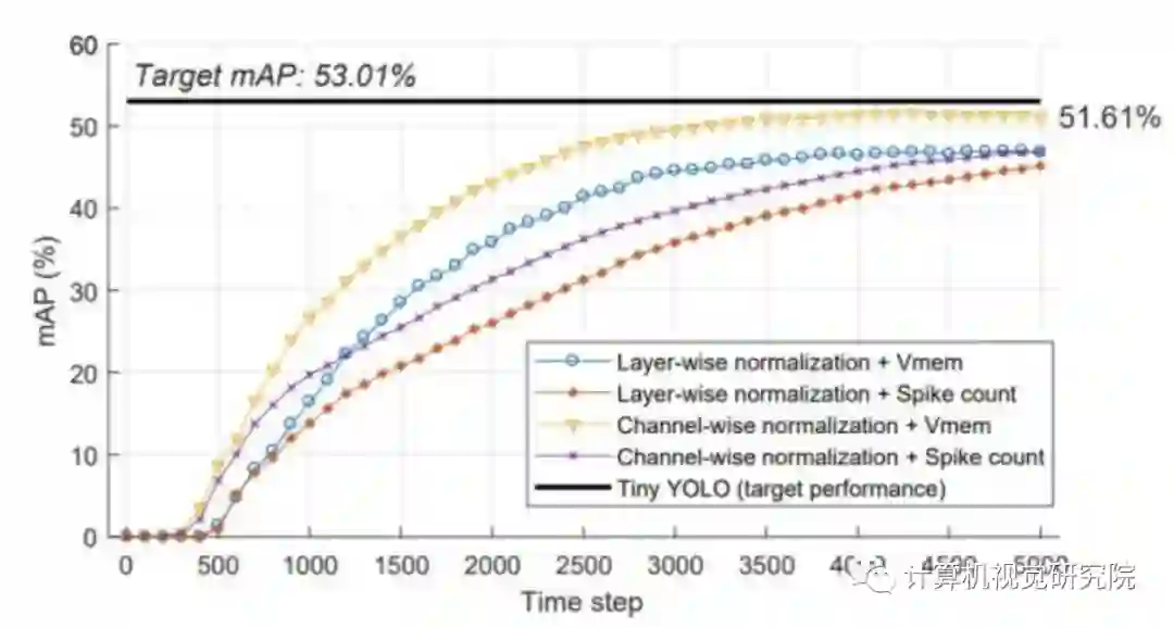 作者使用Tiny YOLO的实时目标检测模型,在脉冲神经网络中实现最大池化层和BN层。模型在PASCAL VOC2007和2012上训练,在PASCAL VOC2007上测试。所有代码基于Tensorflow Eager框架,在V100的GPU上进行实验。
