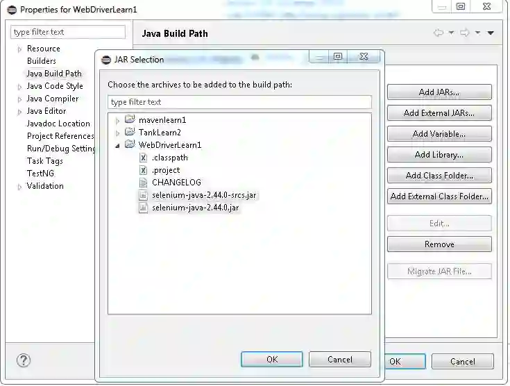 3. 把libs 文件夹下的jar包,全部添加上,再添加 selenium-java-2.44.0-src.jar和selenium-java-2.44.0.jar