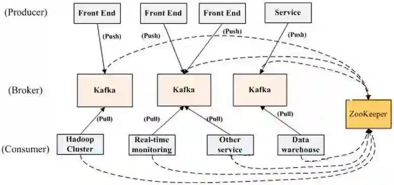 一个典型的Kafka集群中包含若干Producer(可以是Web前端产生的采集数据,或者是服务器日志,系统CPU、Memory等),若干broker(Kafka支持水平扩展,一般broker数量越多,集群吞吐率越高),若干ConsumerGroup,以及一Zookeeper集群。Kafka通过Zookeeper管理集群配置,选举leader,以及在Consumer Group发生变化时进行rebalance。Producer使用push模式将消息发布到broker,Consumer使用pull模式从broker订阅并消费消息。Kafka拓扑结构图如下: