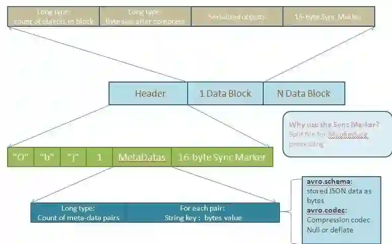 Avro定义了一个简单的对象容器文件格式。一个文件对应一个模式,所有存储在文件中的对象都是根据模式写入的。对象按照块进行存储,在块之间采用了同步记号,块可以采用压缩的方式存储。一个文件由两部分组成:文件头和一个或者多个文件数据块。其存储结构如下图所示: