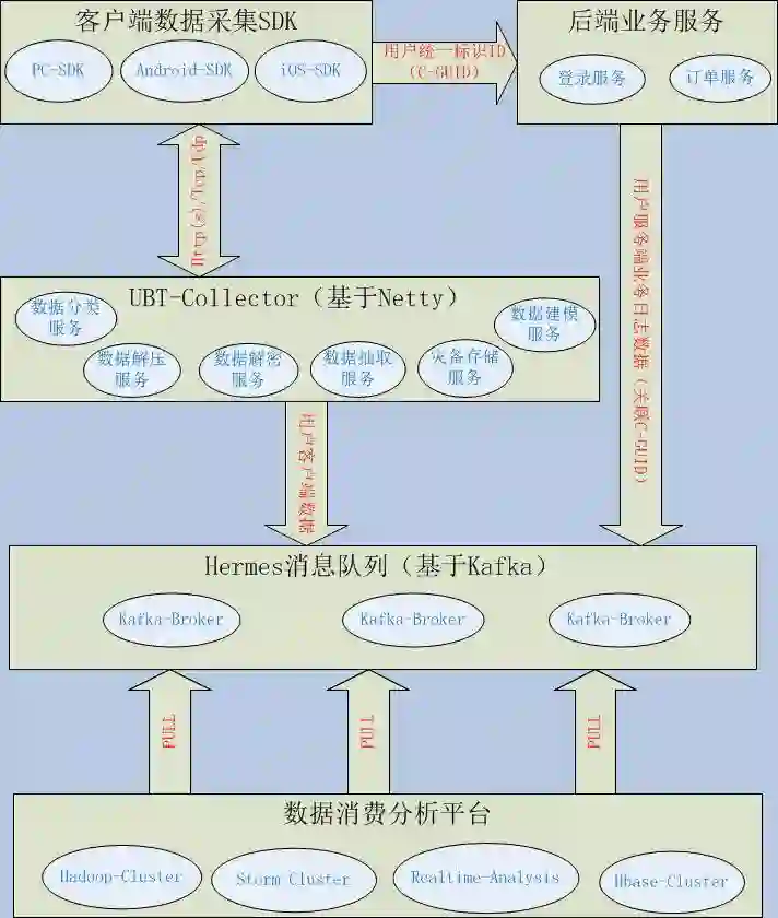 其中整个平台系统主要包括以上五部分:客户端数据采集SDK以Http(s)/Tcp/Udp协议根据不同的网络环境按一定策略将数据发送到Mechanic(UBT-Collector)服务器。服务器对采集的数据进行一系列处理之后将数据异步写入Hermes(Kafka)分布式消息队列系统。为了关联业务服务端用户业务操作埋点、日志,业务服务器需要获取由客户端SDK统一生成的用户标识(C-GUID),然后业务服务器将用户业务操作埋点、日志信息以异步方式写入Hermes(Kafka)队列。最后数据消费分析平台,都从Hermes(Kafka)中消费采集数据,进行数据实时或者离线分析。其中Mechanic(UBT-Collector)系统还包括对采集数据和自身系统的监控,这些监控信息先写入Hbase集群,然后通过Dashboard界面进行实时监控。