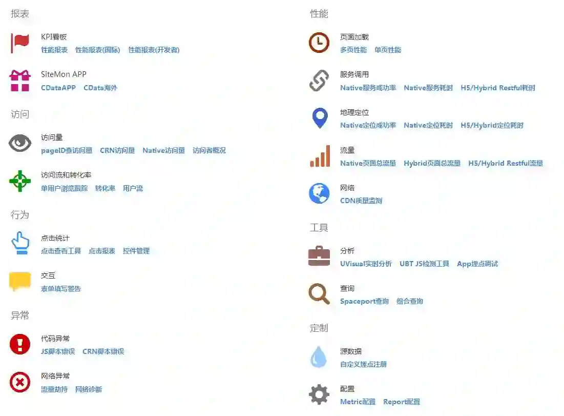 作用:监控系统各业务服务调用性能(如SOA服务、RPC调用等)、页面加载性能、APP启动时间、LBS定位服务、Native-Crash占比、JavaScript错误占比等。按小时统计各服务调用耗时、成功率、调用次数等报表信息。