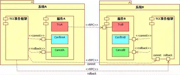 换句话说,业务系统的其他服务在需要调用TCC服务时,根本不需要知道它是否为TCC型服务。因为,TCC服务能被其他业务服务调用的也仅仅是其Try业务,Confirm/Cancel业务是不能被其他业务服务直接调用的。