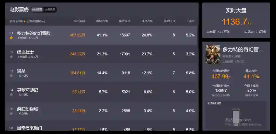 36氪获悉,猫眼专业版数据显示,在影院正式复工后的首个周五,全国单日票房首破千万。截至发稿,总出票量为42.7万张。日票房贡献最高的影片分别为昨日新上映的《多力特的奇幻冒险》、《喋血战士》以及复映片《误杀》。