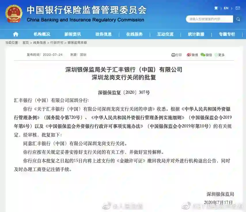 深圳银保监局:同意汇丰银行深圳龙岗支行关闭