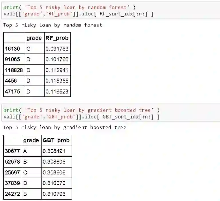 分别在随机森林和提升树模型下打印出最安全和最危险的 5 笔贷款的评级和概率,如下: