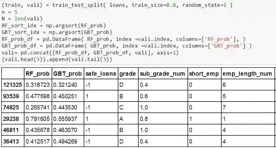 在最安全的 5 笔贷款中,两个树模型预测的贷款都是 A 评级,比较合理;但是在最危险的 5 笔贷款中,随机森林预测的贷款有 D, G 评级,而提升树预测的贷款居然还有 A 评级 (不是那么合理)