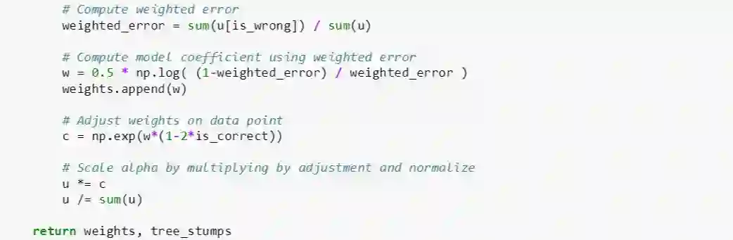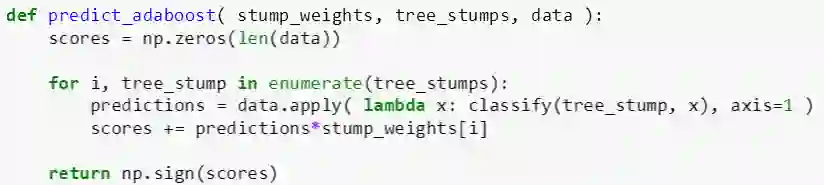 其代码逻辑参考随机森林和提升树一贴的 adaBoost 非常容易看懂。对照下图,adaboost_tree_stumps 主要完成了步骤 1 到 3 而最后得到了 num_tree_stumps 个树桩和对应的权重 (注意这里的权重是每个树桩配给的权重,不要和上面数据的权重弄混淆)。