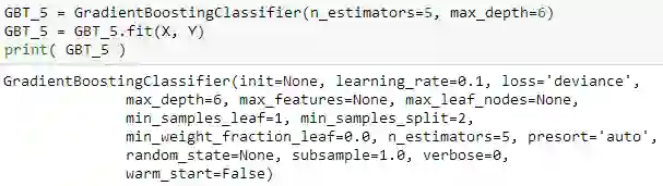 这两个模型都将树的个数 (n_estimators) 和最大树深 (max_depth) 分别设成 5 和 6。然后用 fit() 函数来拟合 X 和 Y 生成树模型。上面两个函数括号里的变量都可以赋予不同的值,斯蒂文此时就只想通过