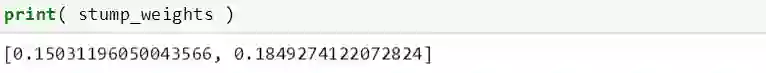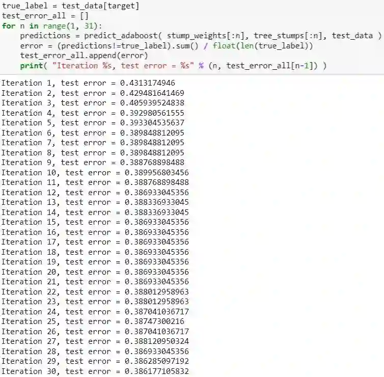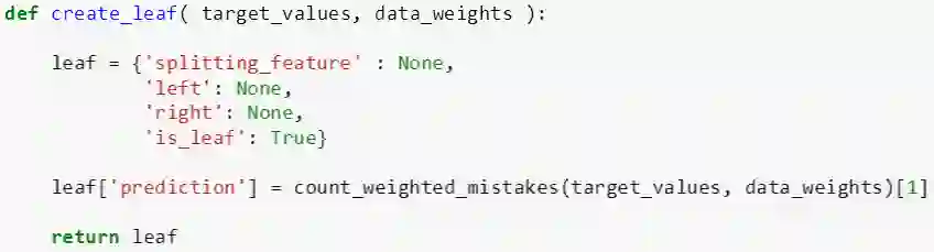 注意代码倒数第二行有个索引 [1],这是因为 count_weighted_mistakes 返回值有两个,第一个是权重总数,第二个是类,这里需要第二个返回值。同样本帖 create_leaf 是上贴写的延伸版,前者把 data_weights 里面的元素全部设为 1 就是后者。
