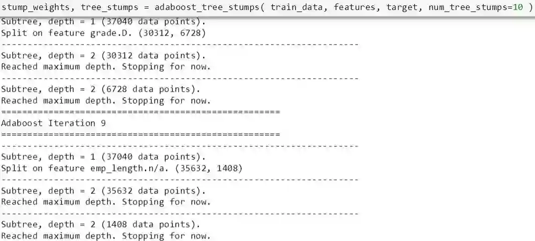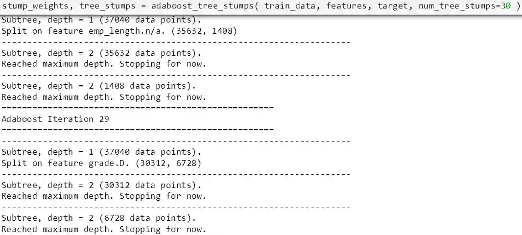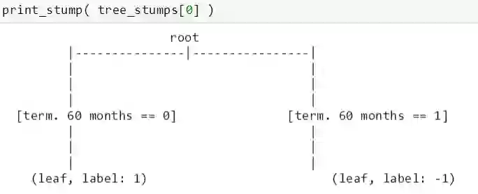 首先斯蒂文先从最简单的 2 个树桩开始,看看那些它们用到哪些特征来分裂树桩,同时也可以测试一下上面的代码是否运行正常。由下图可知,第一个树桩用 term.60 months 来分裂,而第二个树桩用 grade.A 来分裂。