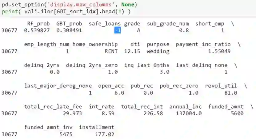 尽管评级为 A,这笔贷款还是被人为分成恶性贷款,见上图蓝色高亮部分的 -1。和其他良性贷款相比,查了查原因可能是迟交款项 (total_rec_late_fee) 29.973 太高,或者负债收入比 (dti) 12.15 太高,或者过去六个月被债权人询问 (inq_last_6mths) 3 次太多。这个有兴趣的同学可以自己继续深挖以下,虽然评级为A,但提升树可能也将其他特征综合考虑而将其分类为恶性贷款。