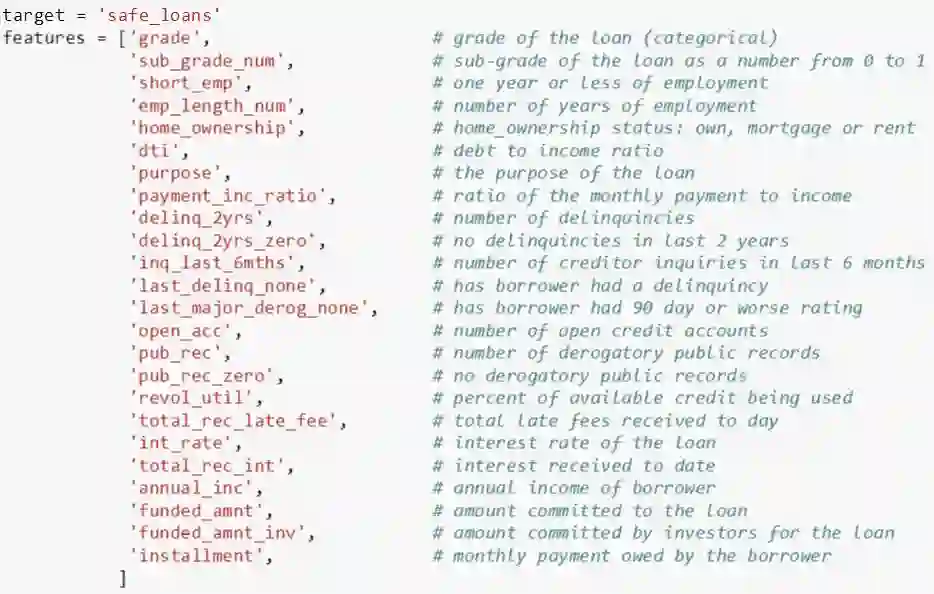 在用 sklearn 自带模型中,我们选取以下 24 个特征 (原来有 67 个特征),包括评级、子评级、工作年数、房屋所有权、负债收入比、贷款目的、违约次数、贷款利率、年收入、月供等等。