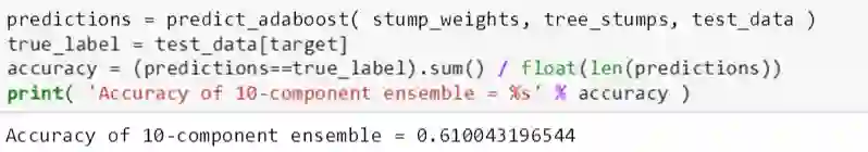 将 predict_adaboost 用到测试数据得到预测值,并和真实值比较算出测试准确率 0.61,并且打印出这 10 个树桩对应的权重,发现权重几乎是逐渐递减的。