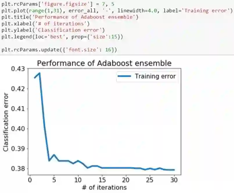 由下图看出,训练误差随着树桩数增加而减少,在前 5 个树桩尤为明显,后面减少的幅度低了很多,因此在本例选择树桩数时,根本没必要选到 30 这么多,具体多少个要看你对误和计算时间的容忍度而权衡决定。