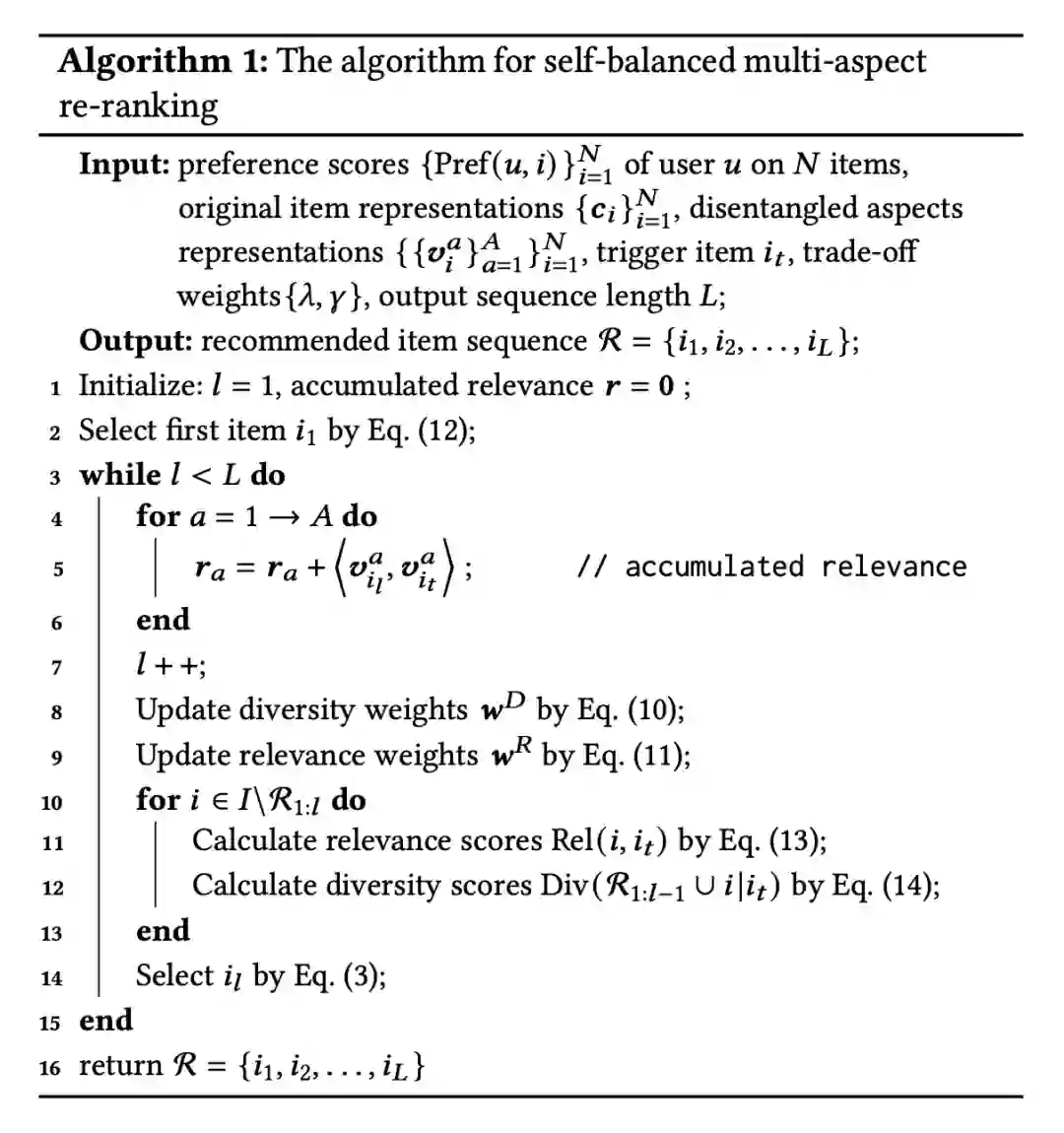 我们来看下自平衡多元重排器是如何生成最终的结果的,这里采用了贪心的选择过程,在第 1 个选择 step,因为当前的已选择集合中还没有任何 item,因此当前 step 退化为单个 item 的相关性得分,计算方式如公式 (9):