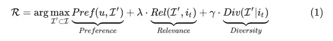 论文中首先将相关推荐任务定义为一个多因子排序问题,将用户的偏好得分、候选集与触发 item 的相关性以及返回推荐 item 集合的多样性综合考虑,最终获得一个更均衡的排序结果。我们可以定义