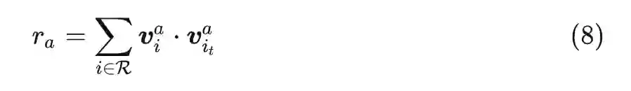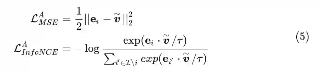 前面介绍了如何使用 item id 的 embedding 和 side information 信息获得 item 细粒度的表征 V,但这里并没有一个明确的监督信号,DAE 是无法学到有用信息的。因此在论文中引入了一个先验信息,即学到的 item 表征应该更接近 item id 的 embdding。基于这个想法,论文中设计了两个 alignment loss 用来对齐 item id 的 embdding 和特征分离表征这两部分信息,loss 的定义如公式 (5):