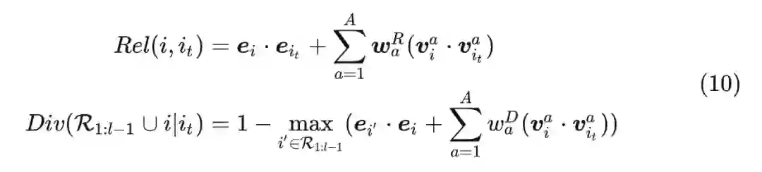 从公式 (2) 来看,这里提出的方法相对于已有的相关性和多样性方法,主要的区别和创新在于除了 item 维度之外,引入特征维度,例如品牌、颜色等 side information 信息进行相关性和多样性的计算。也就是公式 (2) 中的
