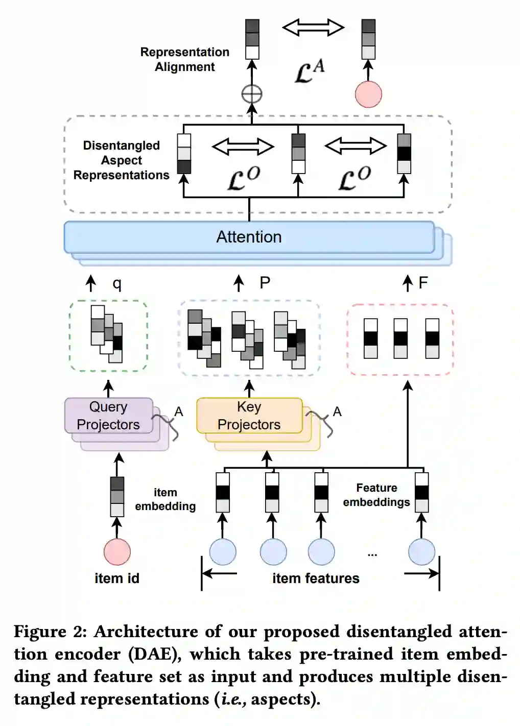 考虑到这个问题,论文中提出了一种解耦注意力编码器(DAE)来将这些特征进行解耦,学习 item 的分离表征