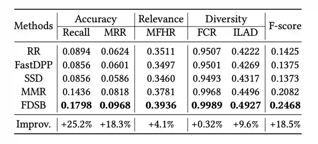 从离线实验结果可以看到,与多个多样性方法相比,FDSB 在精确性、相关性和多样性的指标上都有比较大的提升。