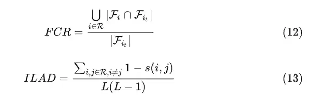 的特征集合。MFHR 通过计算特征的平均命中率来衡量两个 item 间的相关性。为了衡量推荐 item 集合的特征感知多样性,论文里又引入了两个衡量指标 FCR 和 ILAD:
