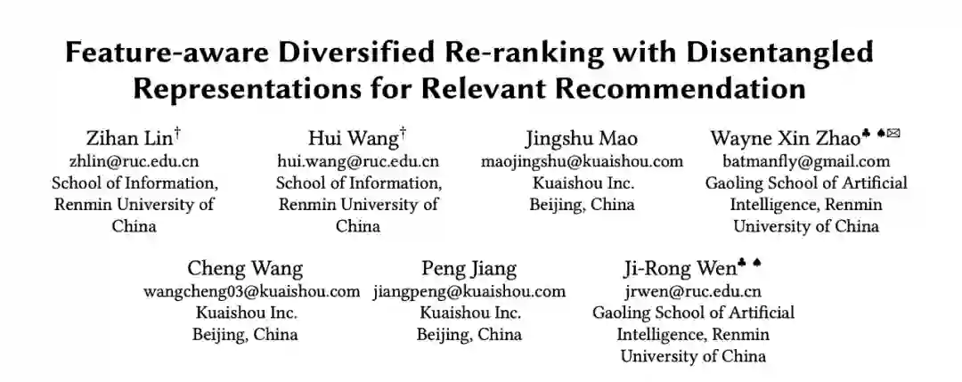 今天跟大家分享一篇快手&人大发表在 KDD 2022 上的多样性推荐论文,论文题目 Feature-aware Diversified Re-ranking with Disentangled Representations for Relevant Recommendation。为了方便描述,这里简写为