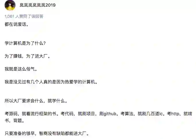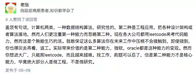 同时他还指出,刷leetcode并不是仅仅为了应试,有的时候去理解吃透题目的出题知识点和出发点是很重要的。除了会使用工具进行应用开发,还要去了解背后的原理细节。不然学任何方面都只是皮毛。