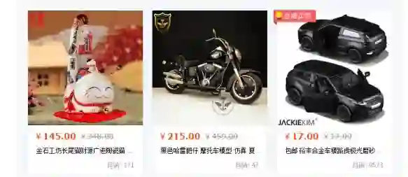 比如下图中,我曾经搜索过桌面摆件招财猫,然后系统推荐给我了同样是桌面摆件的摩托车模型。