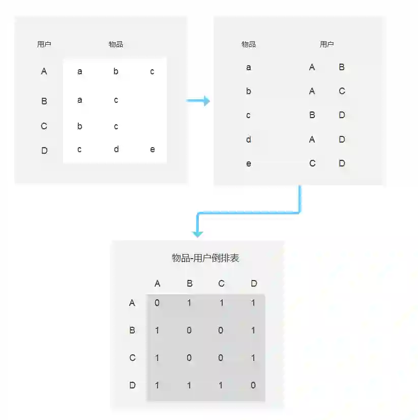 首先需要建立物品到用户的倒排表,对于每个物品都保存该物品产生过行为的用户列表,令稀疏矩阵C[u][v]=|N(u)∩N(v)|,假设用户u和用户v同时属于倒排表K个物品对应的用户列表