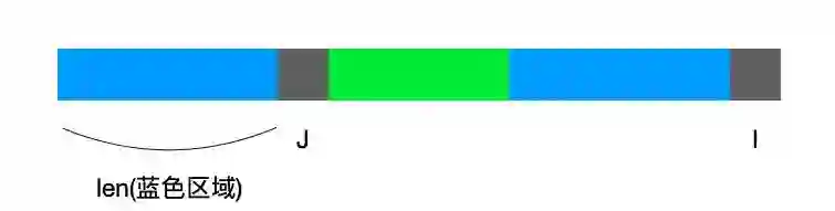 已知蓝色区域相等且长度都为len,那么很明显,next[i] == len,若此时模式串pattern[i] != pattern[j](两个灰色区域不相等)。那么看下图:
