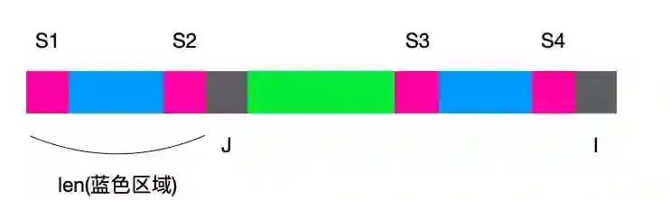 若此时next[j] == len(粉色部分)那么S1==S2,又因为next[i] == next[j],所以S1==S3 且 S3 == S4,则可以推出S1 == S4,这样我们就利用前面所获得的信息,推出了S1 == S4这个信息,然后将J移动到S1后一格,只要再次比较patter[i] 与 patter[j]的相等情况,就可以得出next[i+1]的值。这里因为i始终向后移动,所以也是线性时间复杂度的算法。