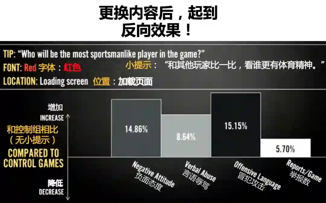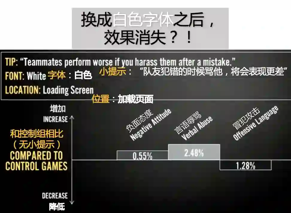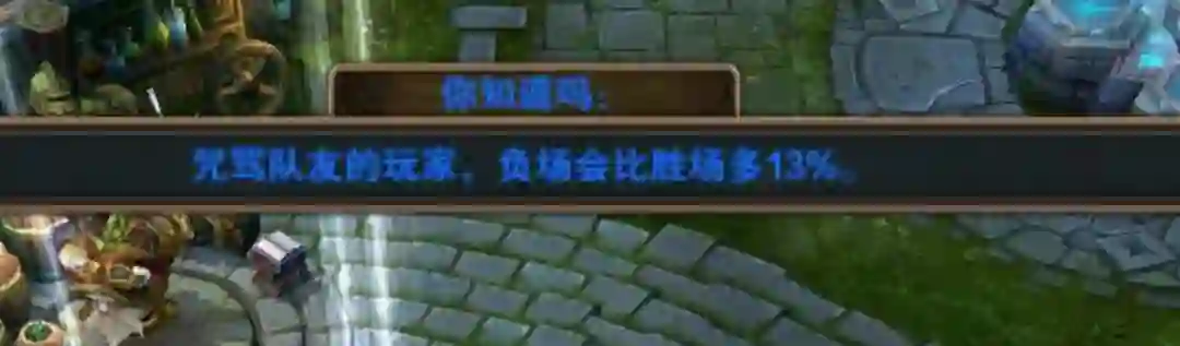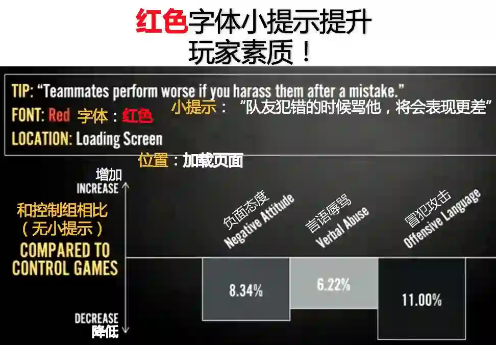 根据LOL的实验,对于同样一条在加载页面显示的小提示:“队友犯错的时候骂他,他们将会表现更差”。