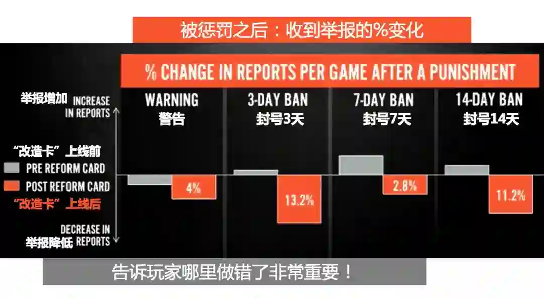 经过优化之后,LOL推出了“改造卡(Reform Card)”:通知玩家封号的时候附上一份内容具体的分析报告,告诉玩家哪里做错了,还有来自社区的改进建议。