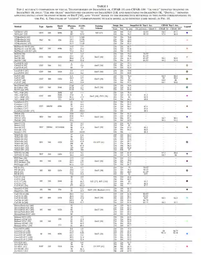 (2)直观的比较。由于这些Transformers在不同的任务中遵循不同的训练方案和超参数设置,本综述通过将它们在不同的数据集和限制下分离,呈现了多个横向比较。在此基础上,我们总结了针对每个任务设计的一系列有前途的组件,包括: 基于层次结构的主干浅局部卷积,基于稀疏注意的空间先验加速,以及用于分割的通用掩模预测方案。