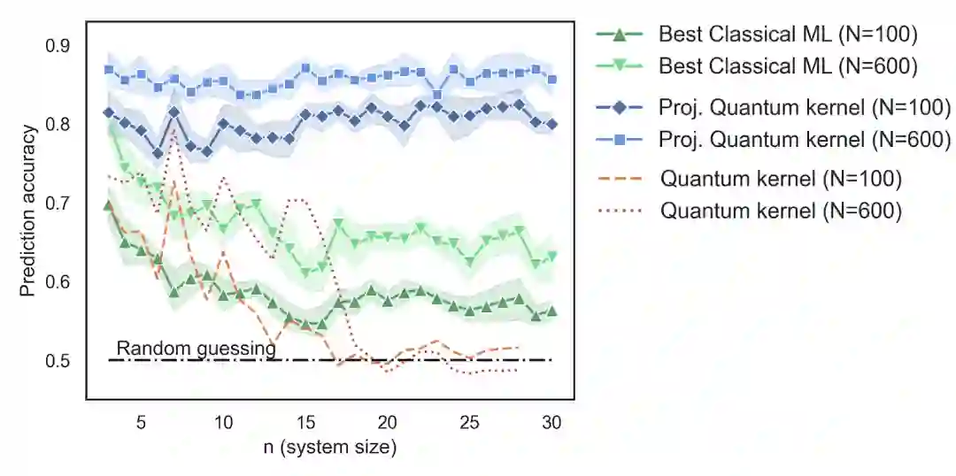 上图展示了在不同训练数据量 (N) 下,与一系列常见传统模型中的最佳模型相比,使用量子模型有着经事实论证的预测优势。相比经测试最佳的传统机器学习,我们引入的映射量子核函数具有显著优势。