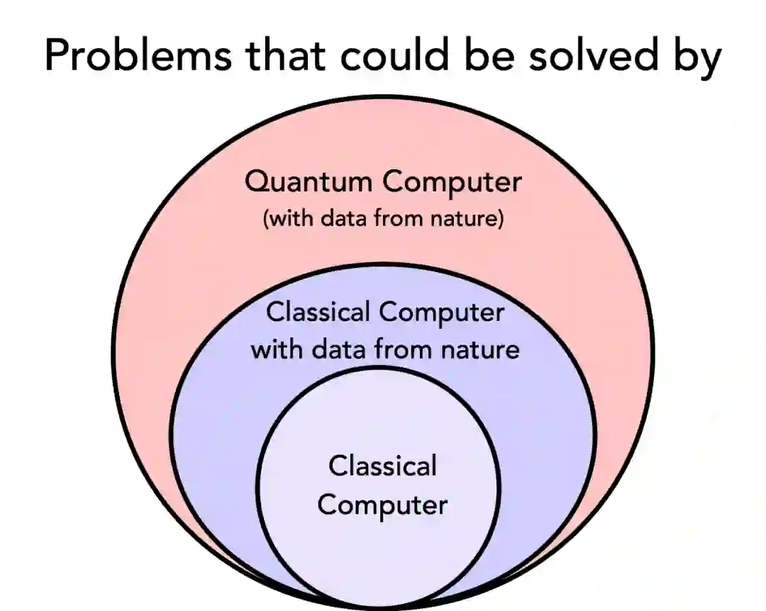 对于因没有数据而难以解决的一些问题,传统计算机通过从现实(例如物理实验)中收集数据并基于这些数据进行学习即可将其解决。但是,使用量子计算机则可以解决更广泛的问题。如果我们设想可以使用量子计算机来模拟现实,那么量子计算机采用从现实收集的数据就不具备更进一步的计算能力。